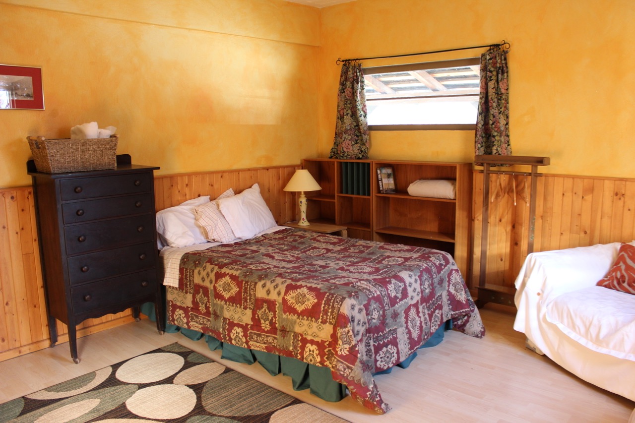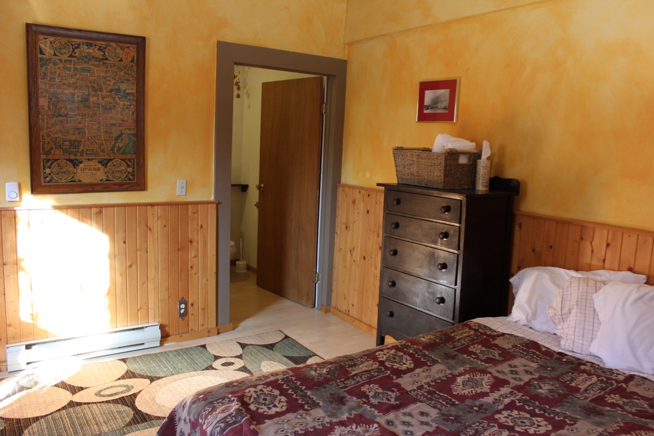 This is our only ground floor room. One double bed, a four piece ensuite bath with grab bars for the tub and toilet, and all doorways are wide enough to accommodate a regular sized wheel chair or walker.